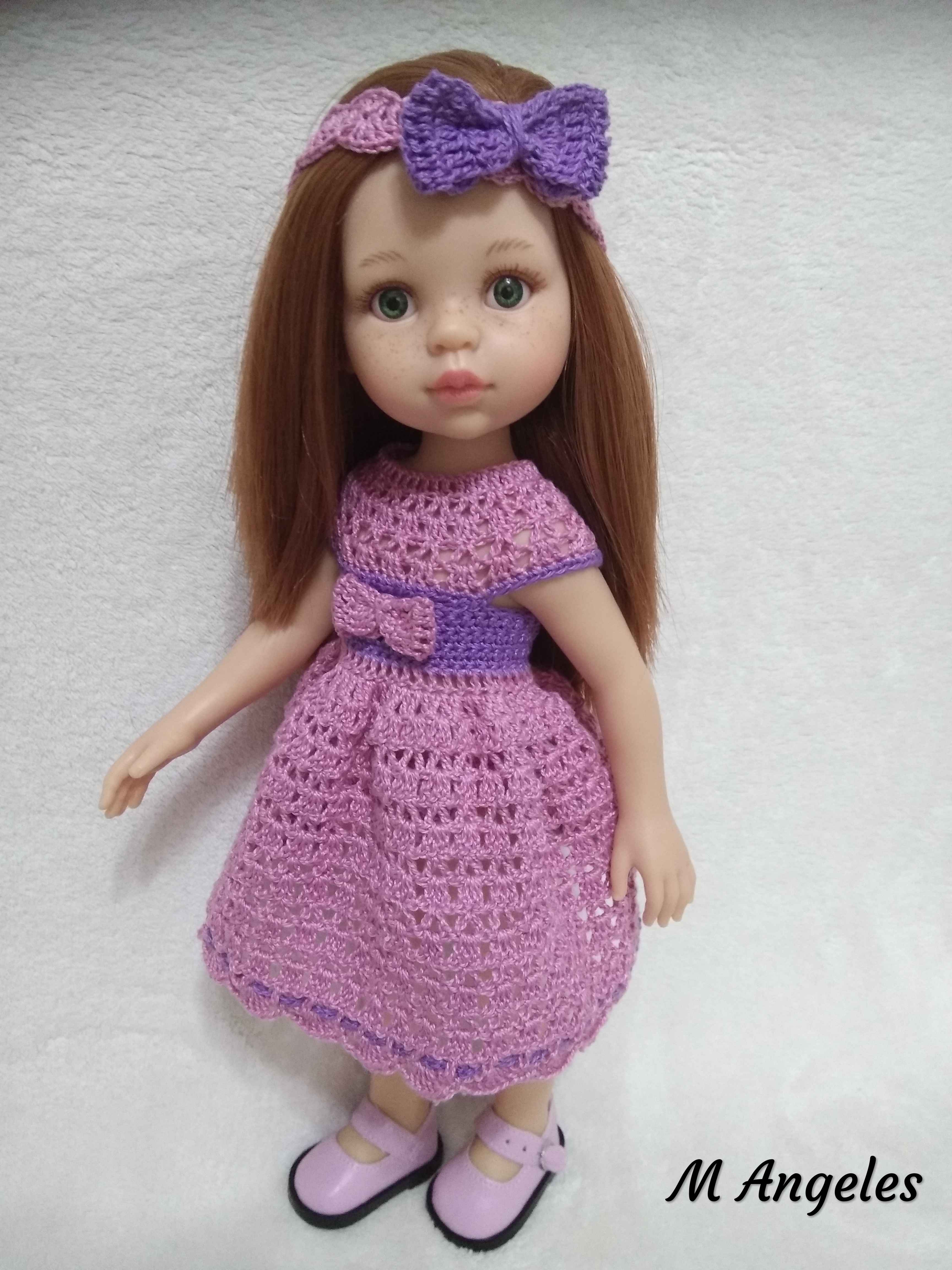 Hola amig@s, hoy traigo una muñeca muy bonita, se llama Cristi y es de Paola Reina......... Está conmigo desde el 12/03/2022 y es que en el grupo me faltaba una pelirroja con ojos verdes.......... Como venía desnuda le he tejido un vestido en hilo de color lila combinado con morado, también lleva las braguitas y la diadema a juego.......... Los zapatos se los he comprado en aliexpress y le quedan genial..........