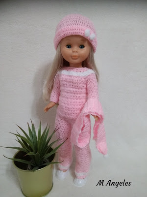 Hola amigas, hoy he escogido a mi Nancy Alicia para enseñaros este conjunto de invierno.......... Como ya ha entrado el invierno y hace tanto frío mi Nancy ha decidido abrigarse con este bonito conjunto de lana.......... El conjunto está compuesto por el pantalón, el jersey, el gorro y la bufanda todo ello tejido en lana de color rosa y combinado con lana de color blanco.......... El gorro y la bufanda van decorados con borlas blancas y le he puesto unos zapatitos blancos que le hacen juego.......... Espero que os guste y hasta pronto. (^_^)